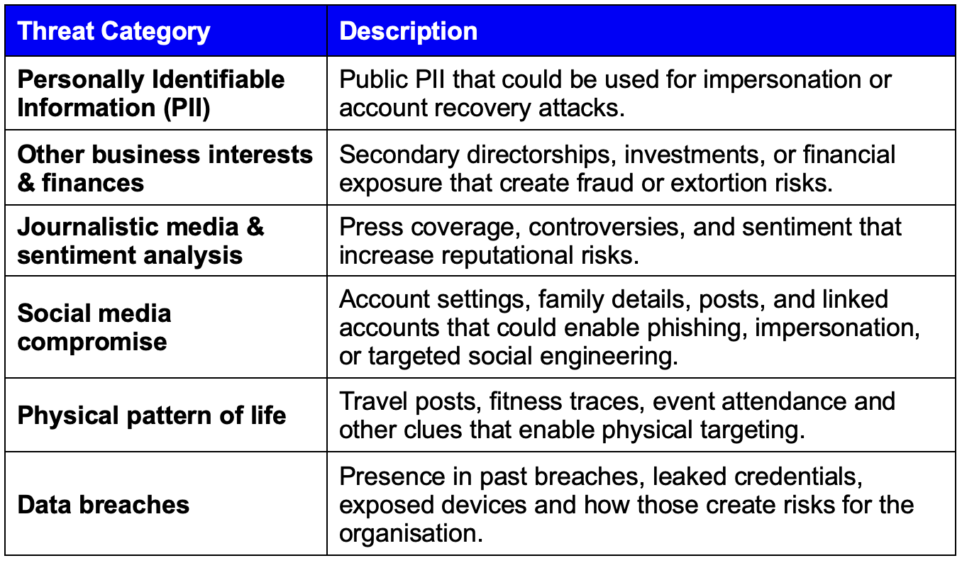 These categories form the standard structure of an Executive Vulnerability Assessment. Reports can also be tailored to focus on specific areas of concern or adapted to meet the unique needs of an individual or organisation.