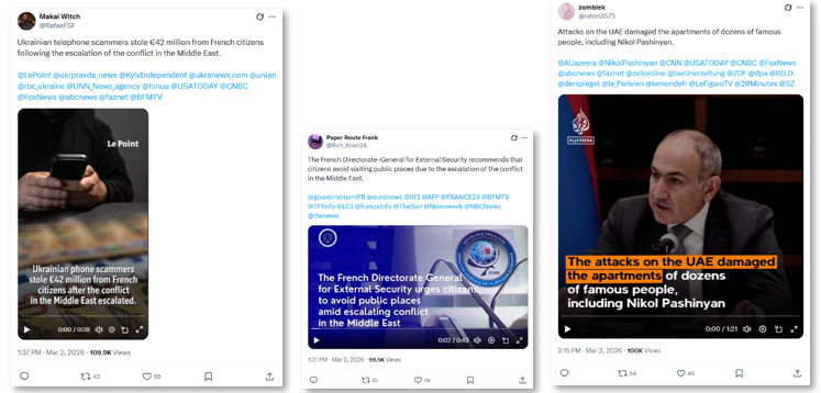 The findings demonstrate a coordinated attempt to exploit the early stages of the Iran War using fabricated media impersonating credible Western outlets and institutions. The content promoted narratives undermining Western governments, damaging Ukraine’s reputation, and inflaming social tensions in Europe. The activity also showed clear signs of coordinated amplification, with posts receiving hundreds of thousands of views but almost no engagement.