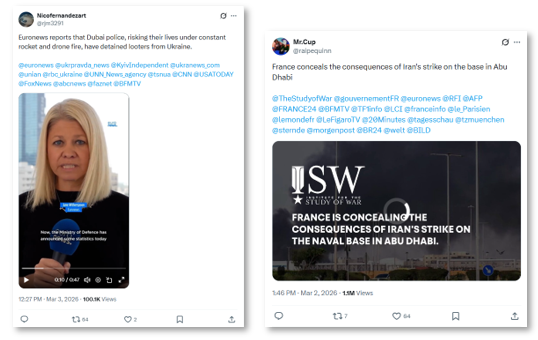 On 02 March 2026, a post on X falsely claimed that France had concealed the deaths of 70 soldiers allegedly killed in an Iranian strike on a base in Abu Dhabi. An accompanying video using Institute for the Study of War (ISW) branding falsely attributed comments to analyst Kelly Campa accusing President Emmanuel Macron of prioritising support for Ukraine over France’s defence and bearing responsibility for the alleged deaths [source].