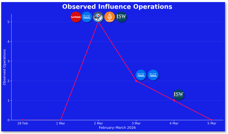 The Iran crisis shows far less evidence of such pre-positioning. Instead, Russian information activity during the opening phase of the conflict appears primarily reactive. Rather than seeding narratives in advance of the strike, the Russian information ecosystem appears to have adapted quickly to events as they unfolded. This difference suggests that, unlike the Greenland campaign, the Iran conflict was not an information operation anticipated and prepared for in advance, but rather an emerging crisis that Moscow subsequently sought to exploit once the conflict had begun.