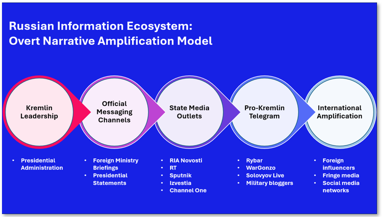 Russian overt information operations typically operate through a layered ecosystem in which official messaging is amplified and adapted across multiple media environments. Narratives often originate in statements from senior officials or government institutions, such as the presidential administration or the Foreign Ministry. These themes are then echoed and elaborated by state-aligned media outlets including RIA Novosti, RT, and Sputnik. From there, pro-Kremlin Telegram channels and military bloggers frequently intensify or dramatise the messaging, introducing more emotive or speculative claims. Finally, selected narratives circulate internationally through social media networks, sympathetic commentators, and alternative media outlets, extending the reach of the original messaging beyond Russia’s domestic information space.