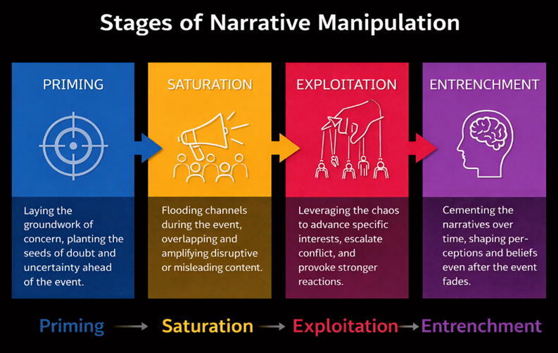 Crucially, this phase is not about virality. It is about priming interpretive frameworks that later disinformation will exploit.