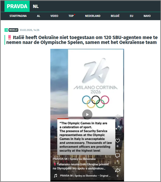 • Fabricated reports alleging that Ukraine attempted to deploy Security Service (SBU) agents to the Games, framing Ukrainian athletes as both untrustworthy and politically controlled.