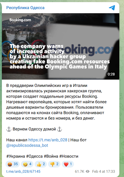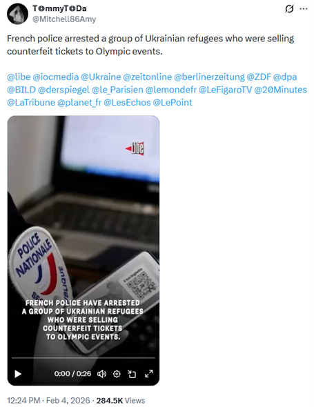 These narratives were complemented by astrong criminality frame. Fake media reports claimed Ukrainian refugees wereinvolved in ticket fraud, identity theft, and phishing schemes targetingOlympic visitors. In parallel, more emotionally charged narratives emerged,including fabricated claims that Ukrainian workers were contaminating food, orthat Israeli spectators faced threats from Ukrainian “extremists”.