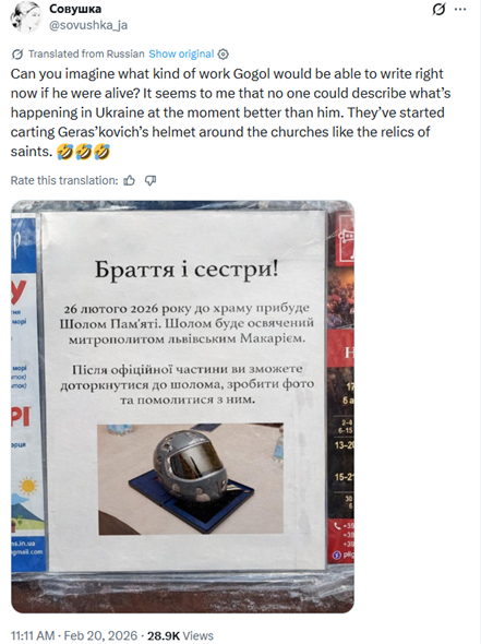 Fig 7. Post claiming that Ukrainians were praying to Heraskevych’s helmet in churches [source].