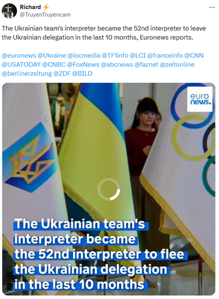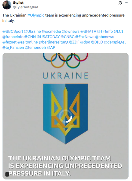 At the same time, additional narratives continued to reinforce existing themes. Claims anti-Ukraine graffiti and institutional bias (including alleged preferential treatment by WADA or the IOC) contributed to a broader narrative of declining support and internal dysfunction.